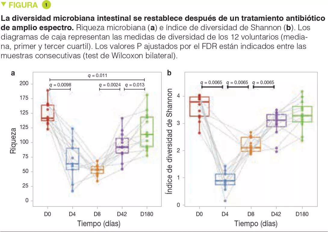 La microbiota intestinal de jóvenes adultos con buena salud es recuperable a los cuatro días tras un tratamiento antibiótico de amplio espectro con un restablecimiento en aproximadamente 6 meses de la mayor parte de las comunidades bacterianas.