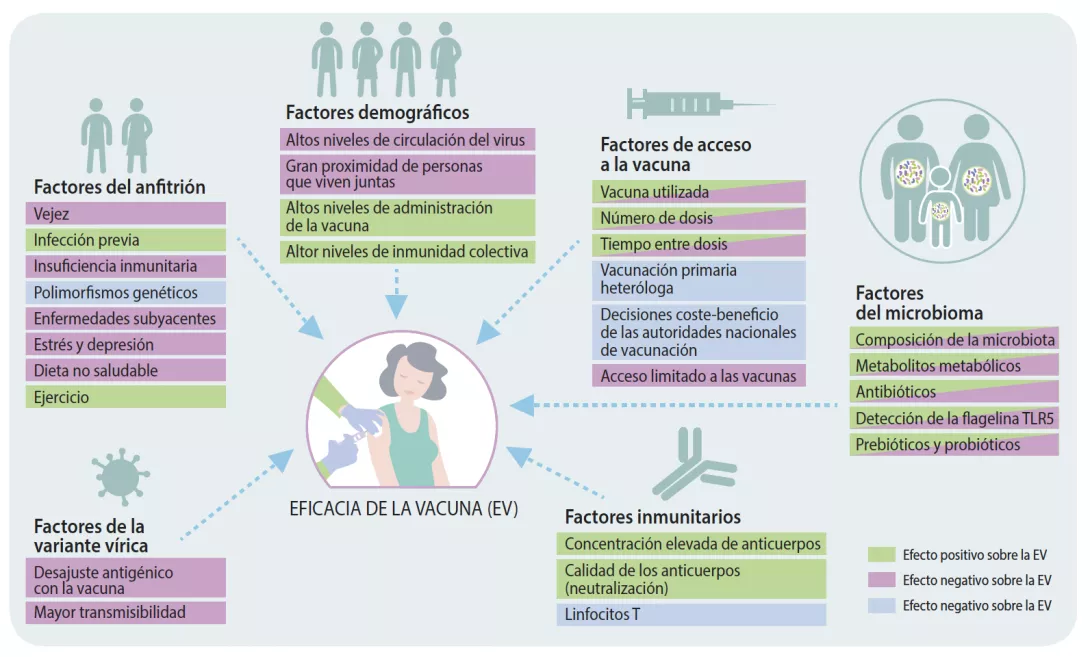 Las vacunas se administran para desafiar tanto al sistema inmunitario innato como al adaptativo. Un biomarcador común de una inmunidad duradera y de la protección contra el SARS-CoV-2 son las respuestas de los anticuerpos. Por razones aún poco comprendidas, las respuestas de los anticuerpos a la vacunación contra el SARS-CoV-2 varían en gran medida entre distintas personas [1]. Según los resultados de ensayos clínicos, la eficacia de las vacunas aprobadas contra el SARSCoV- 2 varía entre el 60 y el 92% frente a las cepas originales del SARS-CoV-2, pero la protección conseguida por la vacuna contra otras variantes del SARS-CoV-2 más preocupantes (es decir, alfa, beta, delta y gamma) parece ser menor [2]. La heterogeneidad entre respuestas vacunales de diferentes personas, la eficacia reducida de las vacunas frente a variantes preocupantes y la posible disminución de la eficacia a lo largo del tiempo ponen en peligro los esfuerzos continuos para controlar la propagación del SARS-CoV-2. Por consiguiente, es fundamental llegar a una mejor comprensión de los factores que provocan las variaciones en la eficacia de la vacuna contra el SARS-CoV-2 a corto y largo plazo.