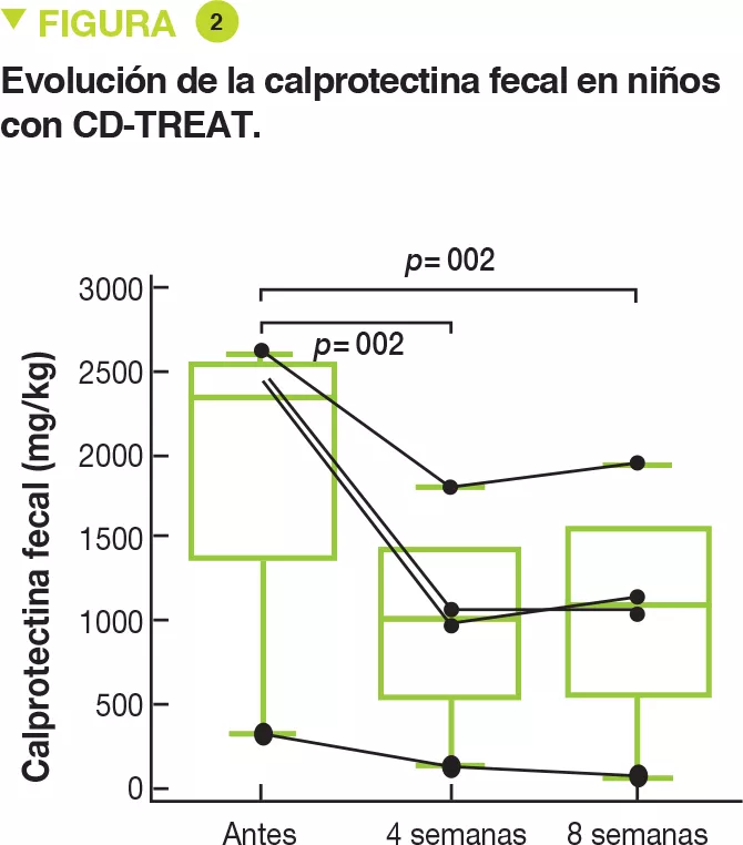 Por último, 5 niños con enfermedad de Crohn de ligera a moderada (wPCDAI entre 22,5 y 42,5) recibieron el régimen CD-TREAT durante 8 semanas. Un niño lo abandonó tras 9 días a causa de una exacerbación. Después de 4 semanas, 3 niños (60 %) tuvieron una respuesta clínica (disminución > 17,5 del wPCDAI) y 2 niños (40 %) se encontraban en remisión clínica (wPCDAI < 12,5). Tras 8 semanas, el 80 % de los niños (4/5) respondió clínicamente y el 60 % (3/5) se encontraba en remisión clínica. Por último, el nivel de calprotectina fecal, que era de 1 960 mg/kg de media antes del régimen, disminuyó un 53 y un 55 % respectivamente tras 4 y 8 semanas (Figura 2). El nivel de calprotectina solo se normalizó en un niño.