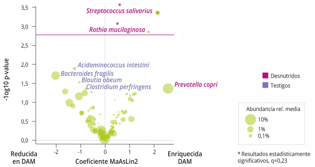 La DAM se asoció con una disminución de la diversidad alfa bacteriana (Shannon), un aumento de la prevalencia y abundancia de Rothia mucilaginosa y Streptococcus salivarius (figura 1), y con un aumento de la relación Bacteroidetes/ Firmicutes. No se observaron diferencias en los análisis funcionales de la MI.