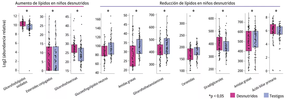 La desnutrición infantil es un grave problema de salud pública y una de las principales causas de mortalidad antes de los cinco años de edad. La desnutrición aguda moderada (DAM) se asocia a un retraso del desarrollo neurocognitivo, pero aún se desconoce la relación. Se asocia también a una disbiosis de la microbiota intestinal (MI), cuyo desarrollo se ralentiza y está marcado por un enriquecimiento en especies de Bifidobacterium y Escherichia. Es posible que estas alteraciones de la MI repercutan en el desarrollo cerebral a través del eje intestino-cerebro, debido a una absorción defectuosa de nutrientes o a la acumulación de metabolitos tóxicos. En esta comunicación entre órganos podrían intervenir indirectamente los lípidos plasmáticos, ya que los lípidos son el constituyente esencial del cerebro y están modulados por metabolitos de la MI, como los ácidos biliares.