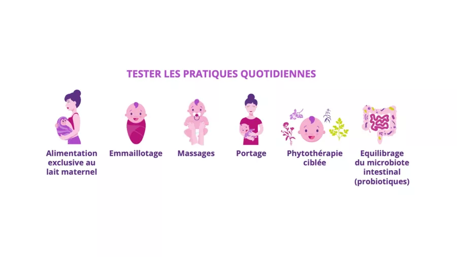 La consultation de votre médecin reste le tout premier moyen de diagnostiquer une colique du nourrisson et de rassurer les parents. Il n’existe pas de traitement à proprement parler10 contre les coliques mais des pratiques quotidiennes simples peuvent permettre de faire disparaître les symptômes. Parmi celles-ci, l’allaitement, le portage ou encore l’équilibrage du microbiote intestinal de l’enfant notamment à travers les probiotiques5. Cette piste semble d’ailleurs prometteuse puisque l’apport en « bonnes » bactéries pourraient réduire l’inflammation intestinale6 et aider à réduire la durée journalière des pleurs après quelques mois d’utilisation11. Les probiotiques peuvent être également utilisés en prévention pour maintenir un bon équilibre intestinal5.