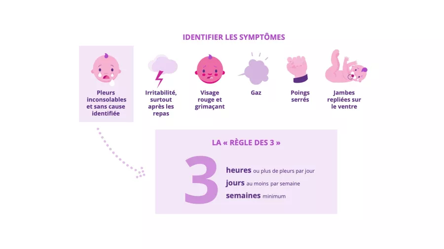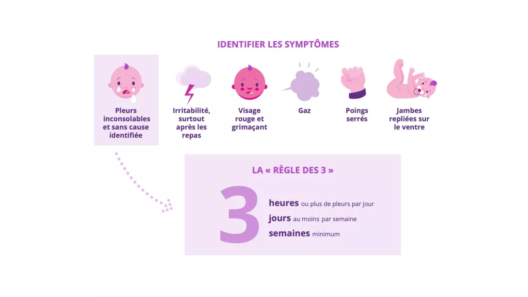 L’enfant pleure beaucoup, il est inconsolable, il grimace et peut avoir le visage rouge. Il garde les poings serrés et peut avoir des gaz5. Pour diagnostiquer la colique du nourrisson, les pédiatres ont longtemps utilisé la « règle des 3 », introduite en 19546. Ces critères ont depuis été adaptés, et une association internationale a fourni une nouvelle définition avec les critères suivants : « périodes récurrentes et prolongées d’agitation, pleurs ou irritabilité du nourrisson, signalés par les parents, qui surviennent sans cause évidente et ne peuvent pas être prévenus ou résolus par les soignants, sans retard de croissance du nourrisson, de fièvre ou de mauvaise santé »7.