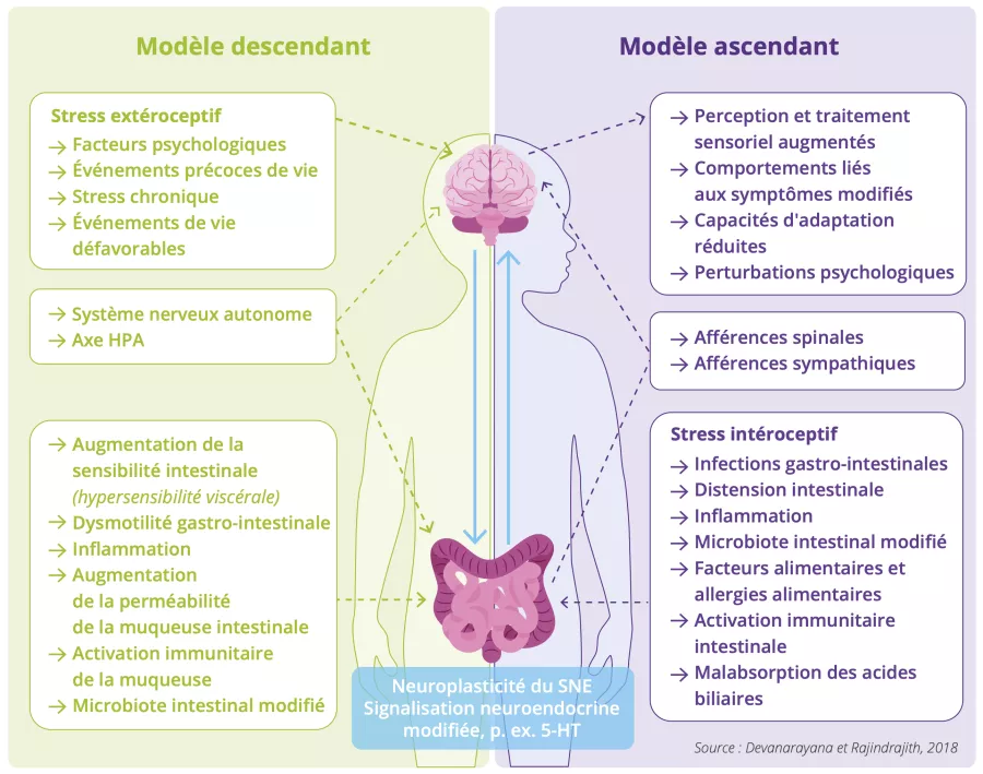 - Le modèle Bottom-up (du bas vers le haut) propose que tout commence dans l'intestin : la maladie de Louise aurait été déclenchée par une infection gastro-intestinale qui aurait généré des messages nerveux d'alerte au cerveau quant à la douleur.