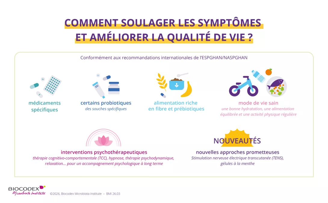 La prise en charge des enfants atteints de SII peut inclure des stratégies non pharmacologiques (régime alimentaire, interventions psychologiques, fibres spécifiques et probiotiques) ainsi que des stratégies pharmacologiques, à condition qu’elles soient adaptées aux symptômes du patient, ce qui nécessite souvent une approche multidisciplinaire. 8