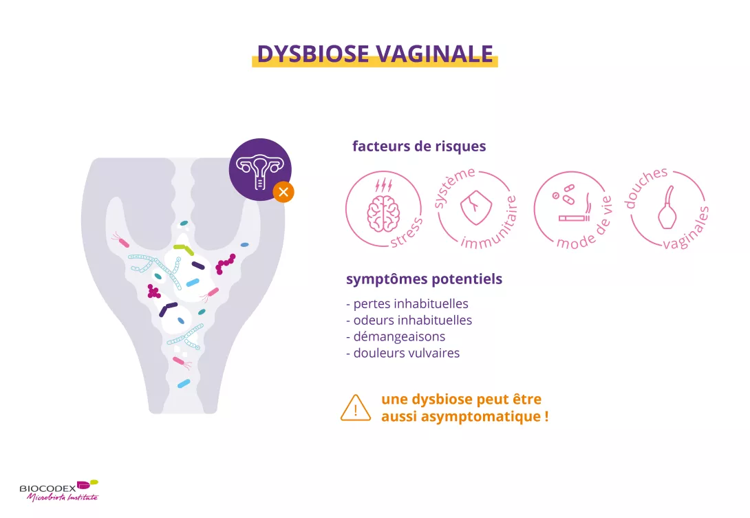 La dysbiose vaginale se caractérise par la perte de prédominance des lactobacilles – les bactéries les plus importantes de la flore vaginale –, ce qui ouvre la voie à des microorganismes opportunistes capables de coloniser le vagin8,11. Si leur présence est souvent accompagnée de pertes vaginales, de prurit et d’une sensation de brûlure, ou encore d’une odeur de poisson, elle peut tout aussi bien être asymptomatique8.
