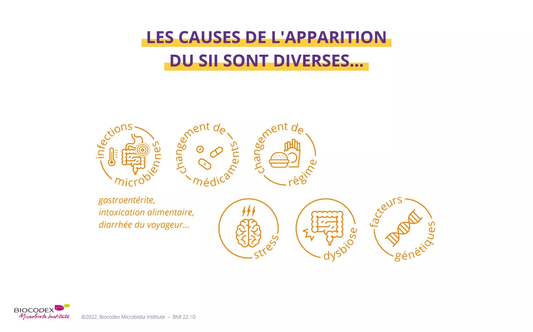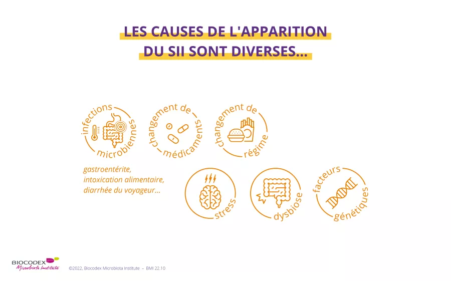Les dernières recherches sont de plus en plus formelles : le microbiote intestinal jouerait un rôle clé dans l’apparition du SII : 6,7 un déséquilibre de la composition du microbiote intestinal, ou dysbiose, est même reconnu par les experts comme une cause plausible de SII. 5 Les dysbioses dues à la prise d’antibiotiques ont d’ailleurs également été associées au développement du SII. 1