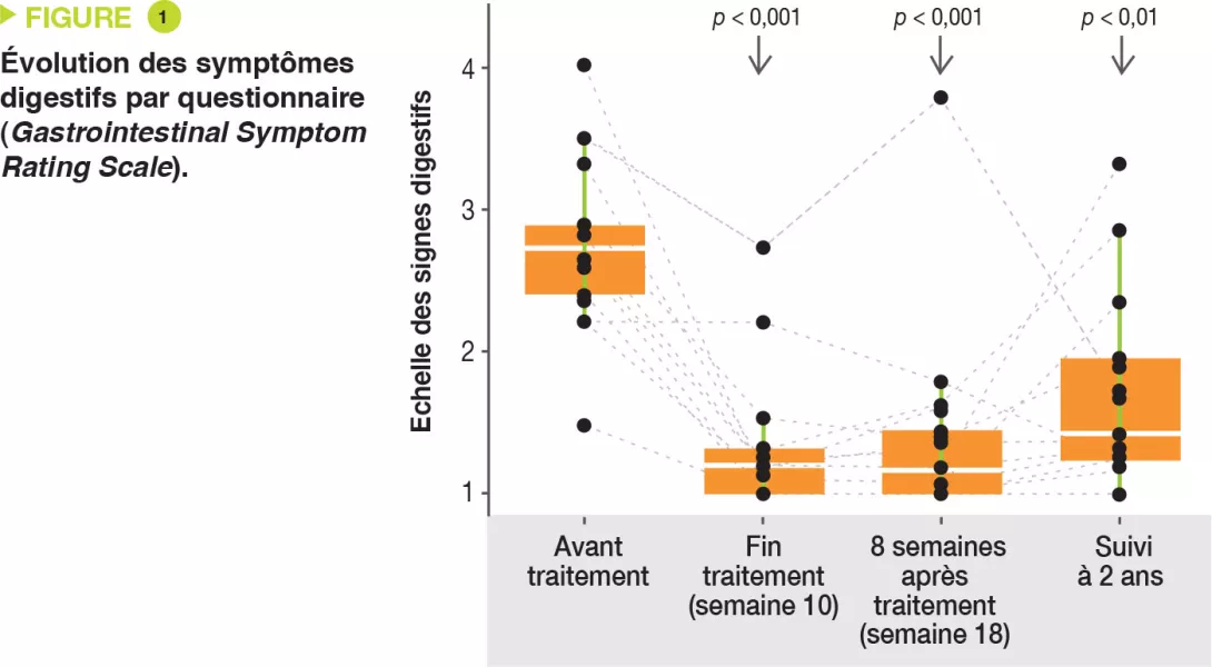Dans cet article, les auteurs ont réévalué les 18 enfants autistes deux ans après le traitement initial par transfert de microbiote. L’amélioration des symptômes digestifs, mesurés par questionnaire (Gastrointestinal Symptom Rating Scale), persistait avec une réduction de 58 % (Figure 1). Tous les symptômes digestifs étaient améliorés (douleurs, difficultés de digestion, diarrhée et constipation). Le transit était toujours amélioré, avec une réduction de 26 % du pourcentage de jours avec des selles anormales.