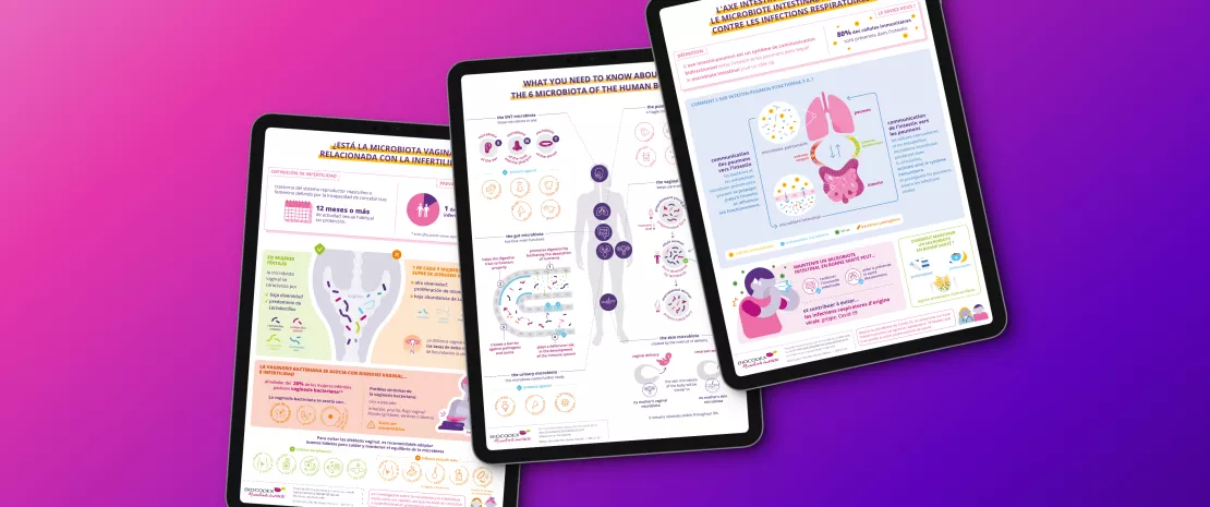 Téléchargez des supports graphiques originaux et engageants pour expliquer à vos patients le rôle essentiel du microbiote dans leur santé quotidienne. Ces infographies claires et accessibles sont spécialement conçues pour simplifier des concepts complexes et renforcer la compréhension des liens entre le microbiote et le bien-être.