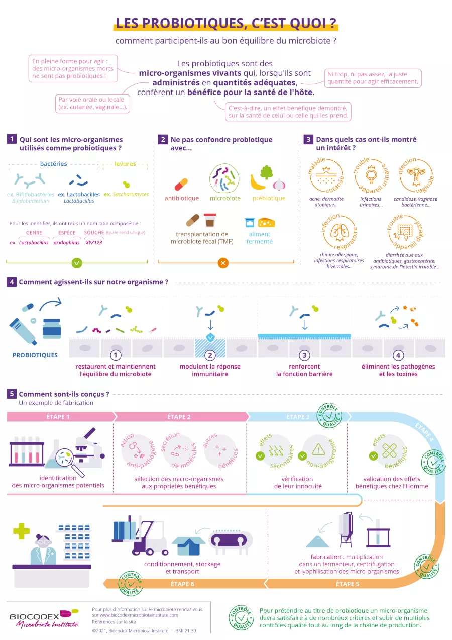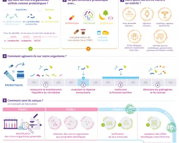 Cette infographie explique ce que sont les probiotiques et comment ils contribuent à l’équilibre du microbiote, favorisant ainsi la santé globale.