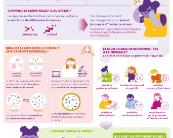 Cette infographie explore le lien entre le microbiote intestinal et le stress, mettant en évidence l’influence de l’axe intestin-cerveau sur le bien-être mental et physique.