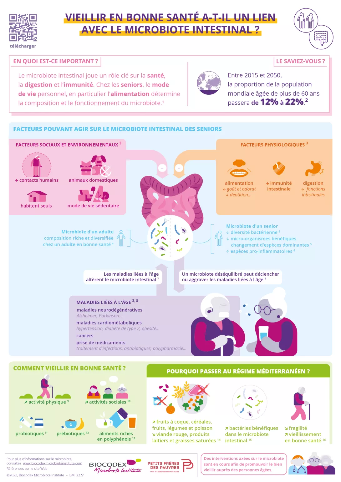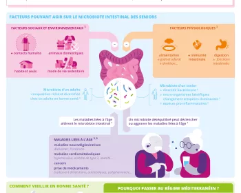 Cette infographie explore le lien entre le microbiote intestinal et le vieillissement, en mettant en avant l’influence de l’alimentation et du mode de vie sur la santé digestive, l’immunité et le bien-être des seniors.