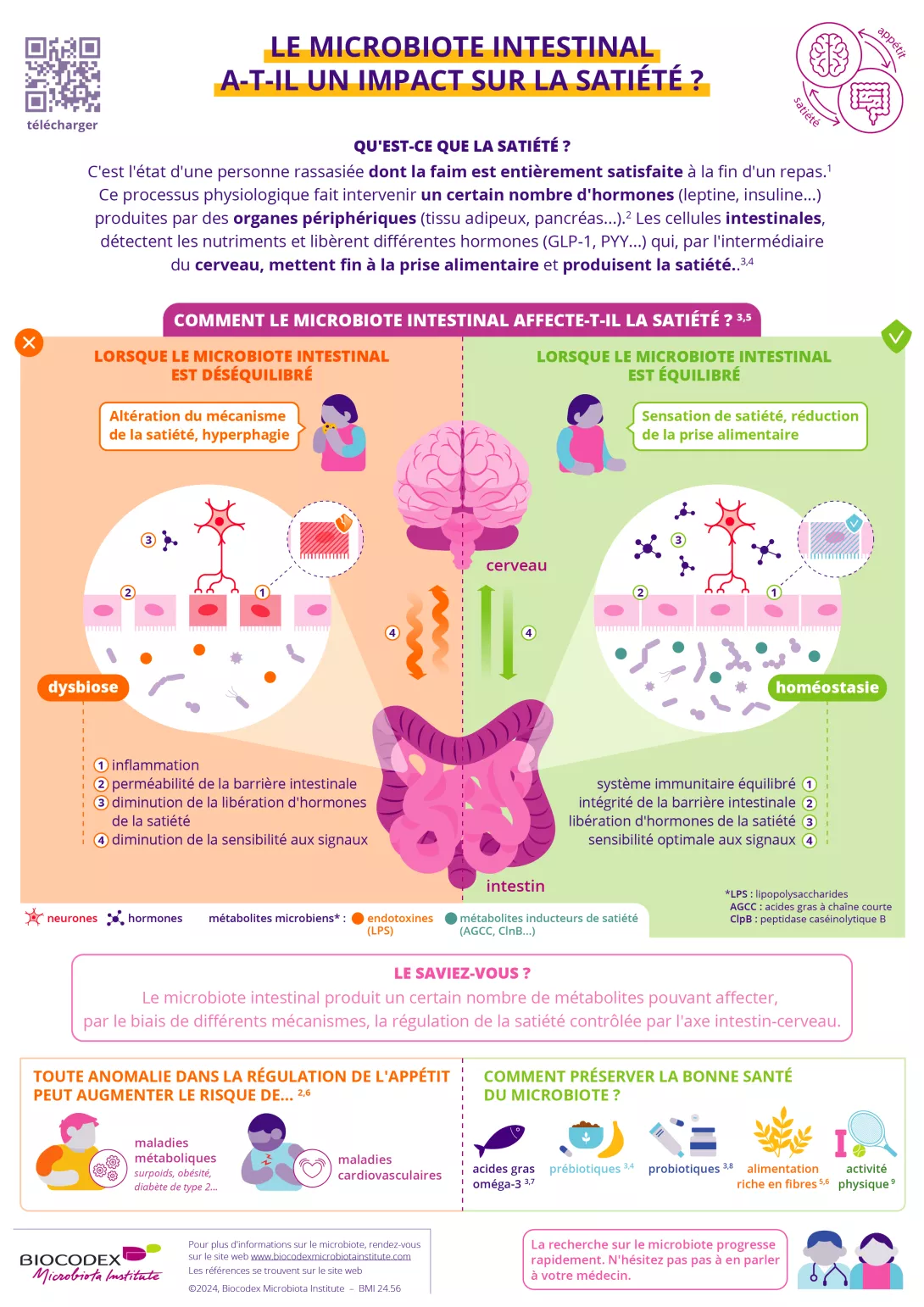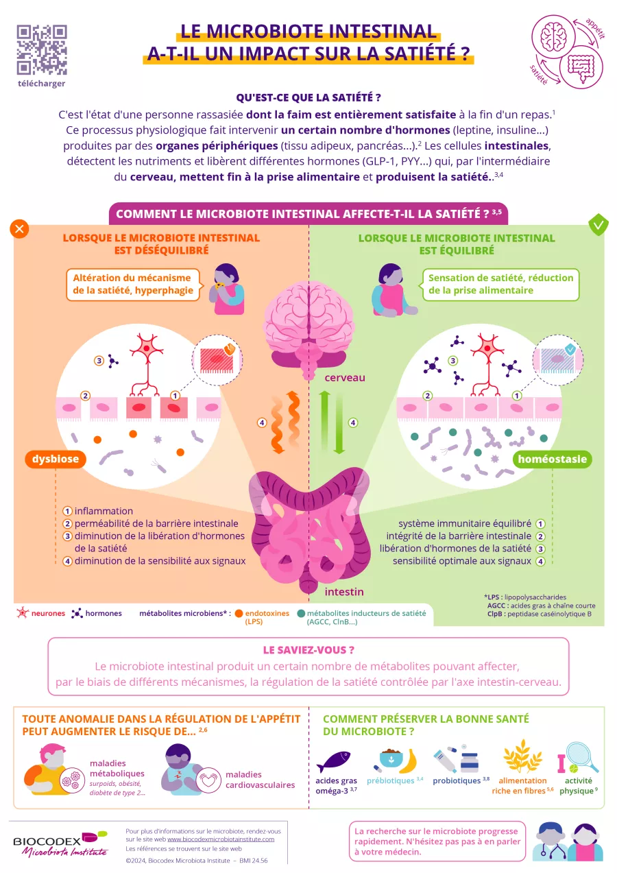 Cette infographie aide les professionnels de santé à expliquer à leurs patients comment le microbiote intestinal influence la satiété.