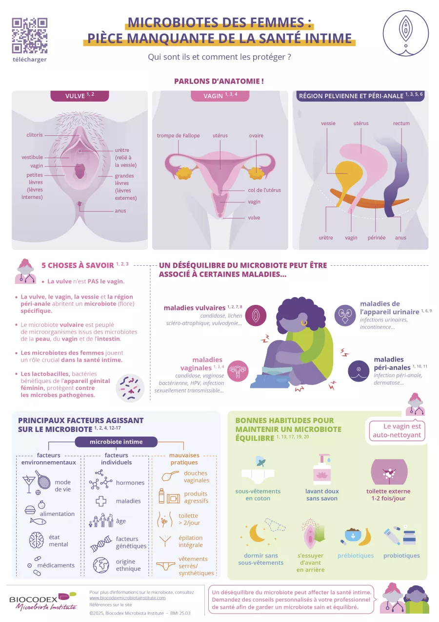 Cette infographie explore le microbiote intime, un élément essentiel mais souvent négligé de la santé des femmes. Elle met en lumière les écosystèmes microbiens distincts de la vulve, du vagin, de la vessie et de la zone périanale, et explique comment leur équilibre protège contre les infections et contribue au bien-être général.