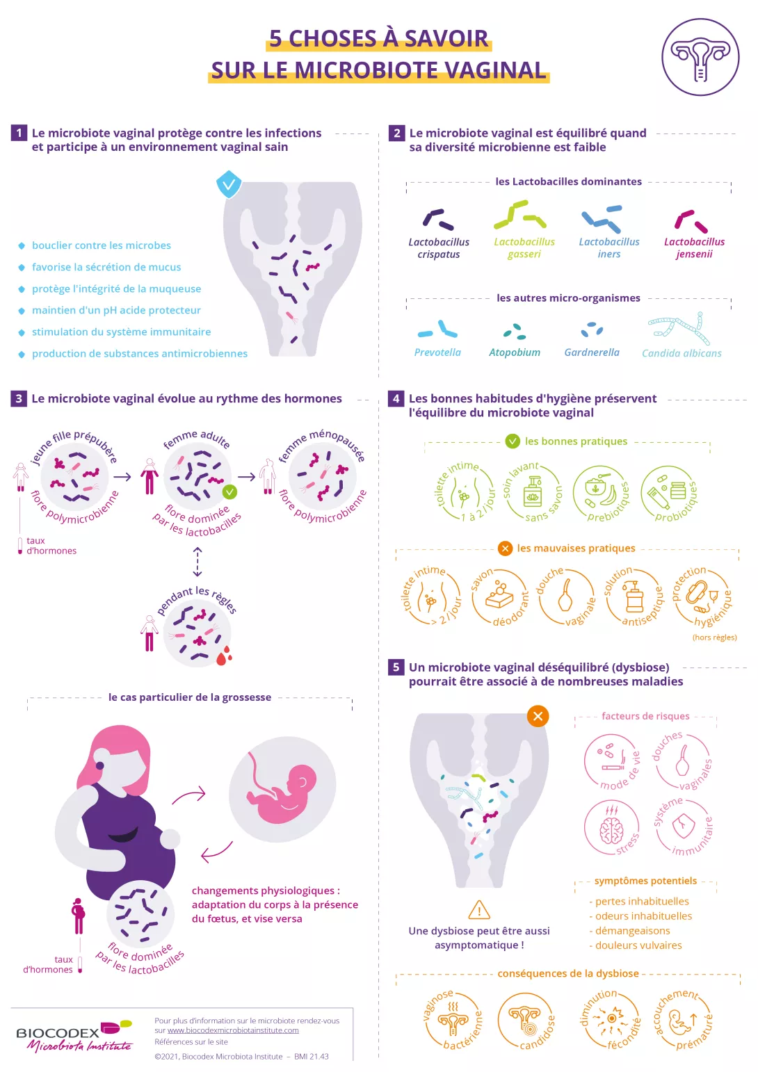 Cette infographie présente 5 éléments essentiels à connaître sur le microbiote vaginal, notamment son rôle dans la protection contre les infections et l'influence des changements hormonaux sur sa composition.