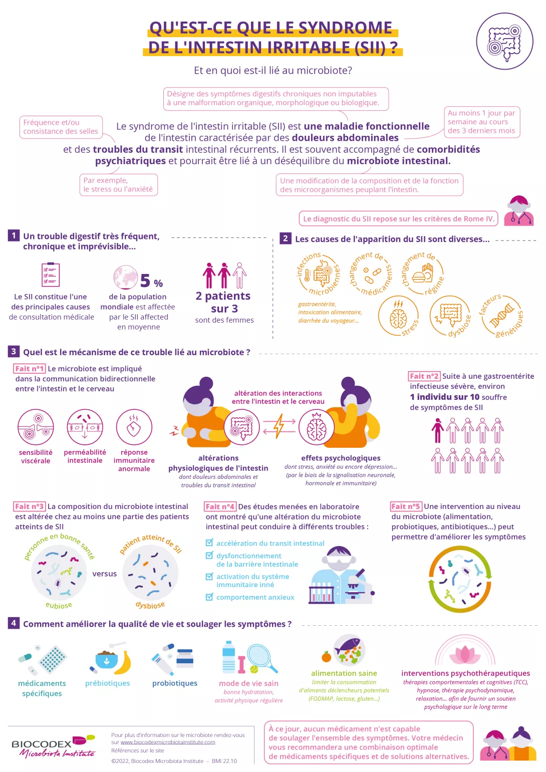 Cette infographie explique le syndrome de l’intestin irritable (SII), un trouble fonctionnel courant caractérisé par des douleurs abdominales récurrentes et des troubles du transit.