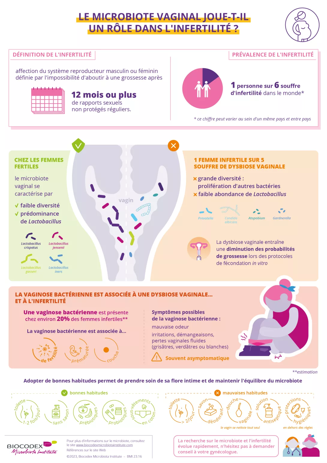 Cette infographie met en lumière le lien entre microbiote et fertilité, soulignant l’importance d’un équilibre optimal grâce à une bonne hygiène et à l’éducation des patientes.