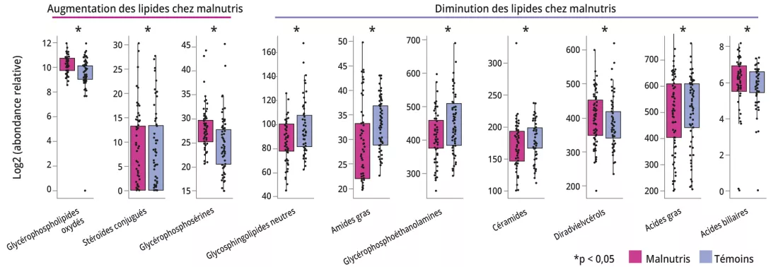La malnutrition infantile est un problème majeur de santé publique et une des premières de cause de mortalité avant l’âge de cinq ans. La malnutrition aiguë modérée (MAM) est associée à un retard du développement neurocognitif, mais le lien reste méconnu. Elle est aussi associée à une dysbiose du microbiote intestinal (MI) dont la mise en place est ralentie et marquée par un enrichissement en espèces de Bifidobacterium et Escherichia. Ces perturbations du MI pourraient avoir un impact sur le développement cérébral par l’axe intestin-cerveau, en raison de défaut d’absorption de nutriments ou d’accumulation de métabolites toxiques. Cette communication interorganes pourrait être médiée indirectement par les lipides plasmatiques car les lipides sont le constituant essentiel du cerveau et sont modulés par des métabolites du MI comme les acides biliaires.