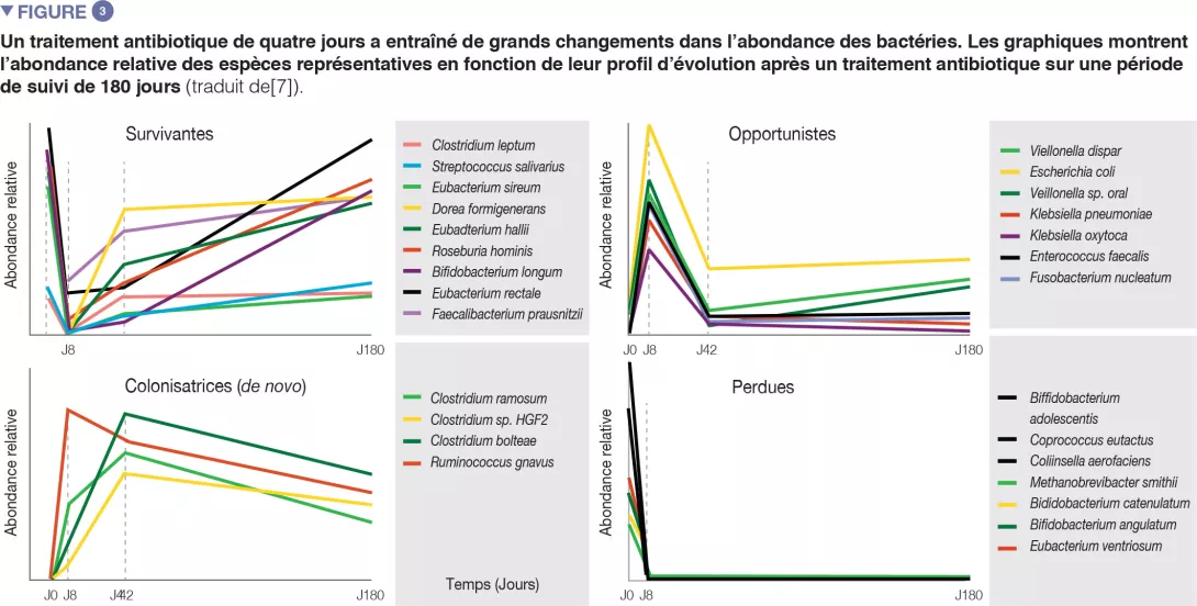 Chez des volontaires sains, une intervention antibiotique de 4 jours a entraîné la prolifération d’entérobactéries et d’autres pathobiontes, comme Enterococcus faecalis et Fusobacterium nucleatum, et la déplétion des bactéries du genre Bifidobacterium et des producteurs de butyrate [7]. Le microbiote intestinal des sujets étudiés est revenu à un état proche de l’état initial en 1,5 mois, bien que 9 espèces, qui étaient présentes chez tous les sujets avant le traitement, soient restées indétectables après 180 jours (Figures 2 et 3).