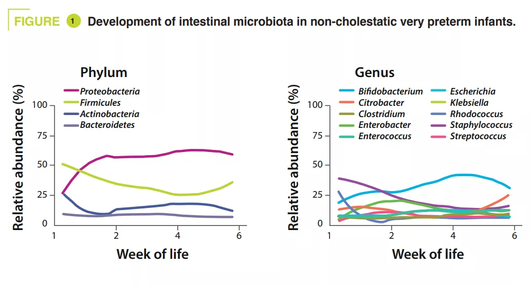 Des selles ont été recueillies de la naissance à six semaines de vie. Leur séquençage (méthode shotgun) a montré chez les témoins que l’alpha-diversité augmentait au cours du premier mois de vie. Au niveau des phyla, les Proteobacteria et Firmicutes étaient les plus abondants ; au niveau des genres, Staphylococcus était le plus abondant à la naissance puis diminuait alors que l’abondance de Klebsiella augmentait progressivement (figure 1). Clostridium perfringens était l’espèce dont l’abondance relative augmentait le plus au cours du temps, qui était défini par l’âge post-menstruel (PMA, somme de l’âge au terme de naissance (SA) et de l’âge post-natal) (p = 0,01). L’analyse métagénomique a montré que la voie métabolique qui était la plus enrichie dans les selles matures (32-40 semaines PMA) par rapport aux moins matures (25- 28 semaines PMA) était celle de la biosynthèse des acides biliaires secondaires.