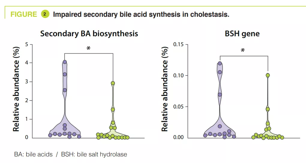 Les acides biliaires sont nécessaires à l’absorption des lipides et des vitamines liposolubles. Lors d’une cholestase, il y a une diminution de la quantité d’acides biliaires au niveau de l’intestin mais également une modification des proportions des différents acides biliaires. En effet, les acides biliaires primaires sont produits à partir du cholestérol et conjugués dans le foie. Leurs interactions avec le microbiote intestinal sont importantes aboutissant à la formation d’acides biliaires secondaires, par l’intermédiaire d’une enzyme microbienne, l’hydrolase des acides biliaires (BSH).