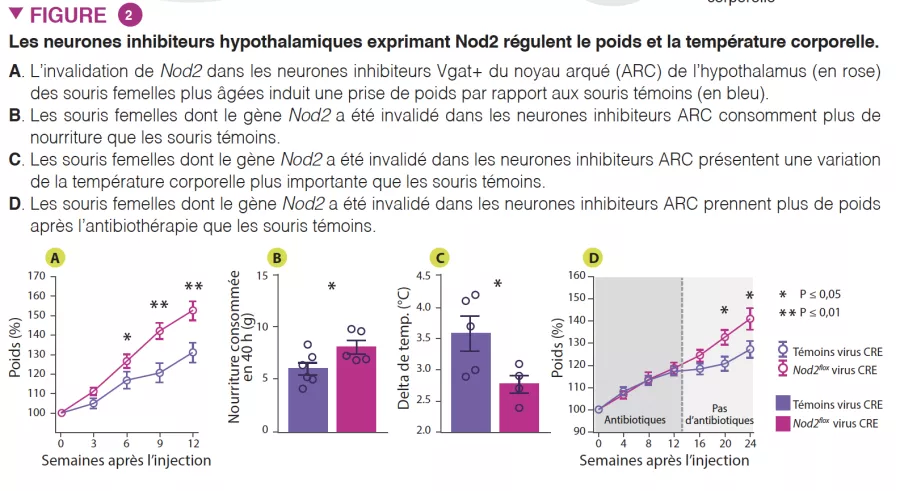 Enfin, pour examiner le rôle du microbiote dans les variations Nod2-dépendantes de l’appétit et de la régulation de la température, les auteurs ont administré des antibiotiques à large spectre aux souris dont le gène Nod2 a été invalidé spécifiquement au niveau des neurones hypothalamiques. Les souris déficitaires en Nod2 au niveau hypothalamique soumises à l’antibiothérapie présentent un appétit et une prise de poids normaux jusqu’à la suppression des antibiotiques, moment auquel elles présentent une augmentation de l’appétit et de la prise de poids par rapport aux souris témoins non déficitaires en Nod2. Ces données suggèrent que les produits dérivés du microbiote peuvent moduler l’appétit chez les souris femelles via un mécanisme Nod2-dépendant.