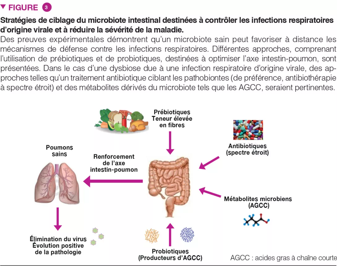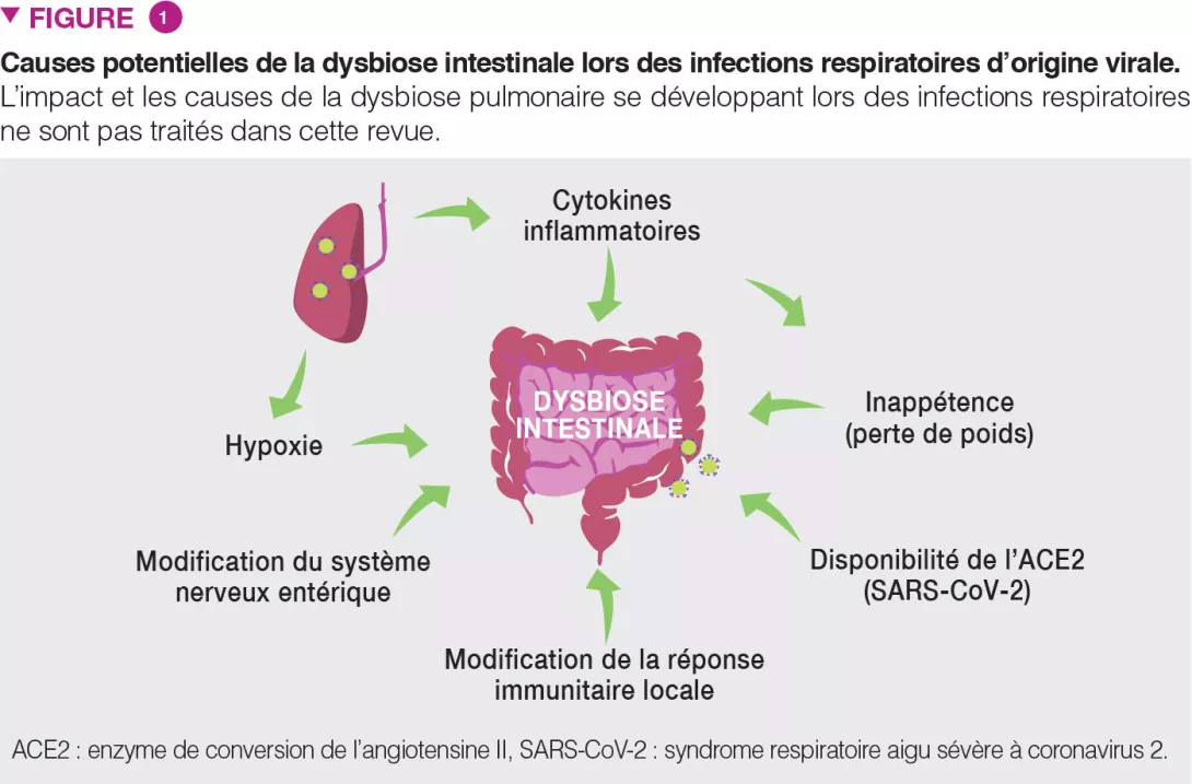 La nouvelle maladie à coronavirus 19 (COVID-19) nous rappelle que les interactions entre le microbiote intestinal et le système immun itaire sont essentielles lors des infections virales des voies respiratoires. Les virus respiratoires peuvent déclencher des symptômes gastro-intestinaux, mettant en évidence le rôle de l’axe poumon-intestin dans la maladie. Des études cliniques et l’exploitation de modèles expérimentaux indiquent que les infections respiratoires aiguës d’origine virale modifient la composition et les fonctions du microbiote intestinal. Dans cette revue, nous examinons ces changements majeurs et discutons des causes potentielles de la dysbiose intestinale induite lors d’infections respiratoires virales. Nous présentons également les conséquences de la dysbiose intestinale sur la maladie. Enfin, nous suggérons des stratégies interventionnelles visant à cibler le microbiote intestinal afin de r éduire la sévérité des maladies respiratoires d’origine virale.