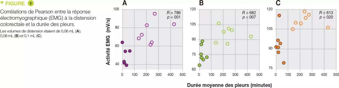 Les lavements rectaux de selles de nourrissons avec coliques ont induit une hypersensibilité viscérale significative lors de la distension rectale avec des volumes plus importants (+ 55 %, p < 0,001 à 0,06 mL ; + 27 %, p < 0,001 à 0,08 mL et + 19 %, p < 0,001 à 0,1 mL) (Figure 1), mais également en réponse globale (augmentation de l’aire sous la courbe de + 33 %, p < 0,001). En outre, il existait une corrélation positive avec la durée des pleurs à ces volumes de distension (Figure 2).