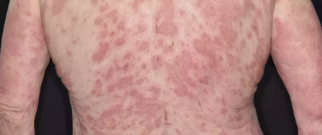 Atopic dermatitis on the upper body of an 83 year old male patient. Atopic dermatitis, also called atopic eczema, is an inflammatory skin reaction that occurs without any obvious external cause.