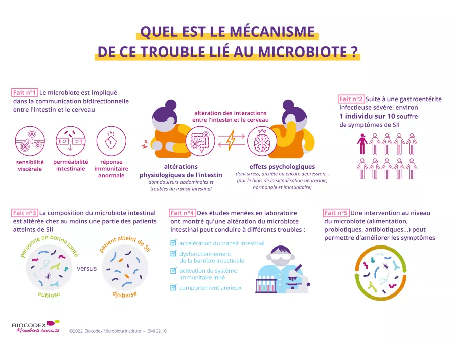 Les causes du SII sont encore mal comprises. Le risque de développer un SII serait multiplié par cinq après une infection bactérienne causant une diarrhée aiguë. Un dysfonctionnement de la communication entre le cerveau et l’intestin en lien avec un déséquilibre de la flore intestinale est évoqué. Dans la plupart des cas, il a été observé une (sidenote: Dysbiose La « dysbiose » n’est pas un phénomène homogène : elle varie en fonction de l’état de santé de chaque individu. Elle est généralement définie comme une altération de la composition et du fonctionnement du microbiote, provoquée par un ensemble de facteurs environnementaux et liés à l’individu, qui perturbent l’écosystème microbien. Levy M, Kolodziejczyk AA, Thaiss CA, et al. Dysbiosis and the immune system. Nat Rev Immunol. 2017;17(4):219-232. ) des espèces bactériennes composant le microbiote, avec moins de bactéries favorables et plus de bactéries néfastes. Ces dysfonctionnements seraient à l’origine de troubles moteurs de l’intestin : le transit est ralenti, la barrière intestinale modifiée et une inflammation légère se développe. Ils entraînent une hypersensibilité de la muqueuse qui rend douloureux des phénomènes habituellement normaux comme les mouvements de gaz intestinaux.