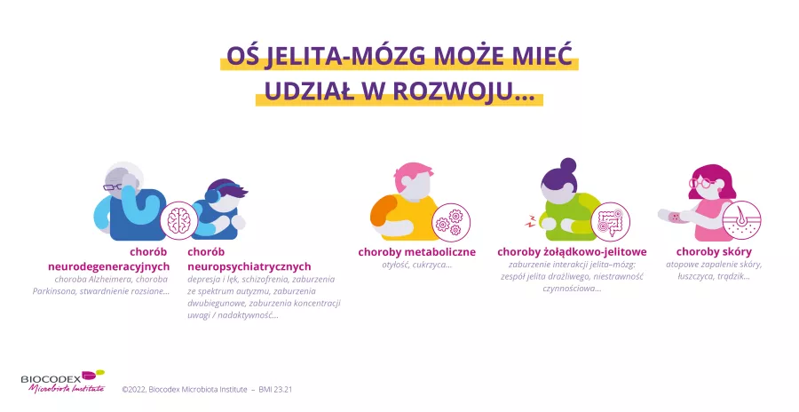 Zaburzenia tej osi oznaczają złą komunikację między mózgiem a jelitami – albo wysyłane są błędne sygnały, albo otrzymywane komunikaty są błędnie rozumiane lub nadinterpretowane... Krotko mówiąc, jelita i mózg przestają się nawzajem rozumieć. Badania naukowe pozwalają coraz lepiej zrozumieć oś jelita-mózg i wskazują na udział mikrobioty jelitowej w coraz większej liczbie chorób8,17.