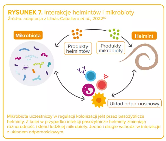 Z kolei infekcja pierwotniakami pasożytniczymi zmienia mikrobiotę jelitową 48,49. Co do helmintów, złożone interakcje między robakami a mikrobiotą („dwoma starymi przyjaciółmi człowieka”50) są obecnie przedmiotem badań50 (rysunek 7). Autorzy zgadzają się co do istnienia złożonych, dynamicznych powiązań między pasożytem (pasożytami), mikrobiotą gospodarza a jego odpornością – zdolną do kształtowania efektów klinicznych infekcji pasożytniczych. 46,48