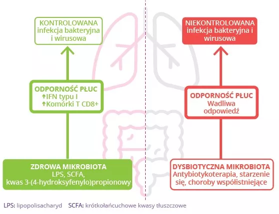 starzenie się lub chorobę ma związek z zaburzeniem odpowiedzi immunologicznych i homeostazy dróg oddechowych,3 co wskazuje, że mikrobiota jelit może wpływać na rozwój chorób w całym organizmie, w tym również infekcji dróg oddechowych ( (Fig 6).4