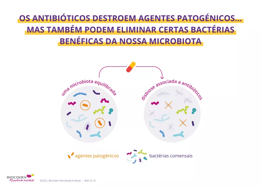 A exposição precoce ou repetida a antibióticos pode ter um efeito duradouro na composição da microbiota e aumentar o risco de distúrbios imunológicos, digestivos ou alérgicos. Os seus efeitos nem sempre cessam no final do tratamento. A sua influência na microbiota pode deixar marcas significativas na nossa saúde. Esses distúrbios lembram-nos da importância do uso sensato para proteger a nossa saúde a longo prazo e limitar os desequilíbrios na microbiota, conhecidos como disbiose (link para a página sobre disbiose).