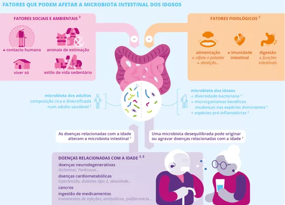 O avanço na idade está geralmente associado a uma alteração da microbiota intestinal. Com o passar do tempo, esta tende a perder sua diversidade e equilíbrio (disbiose), contribuindo assim para uma acentuação dos processos inflamatórios e para um aumento da suscetibilidade às doenças que fragilizam os idosos.