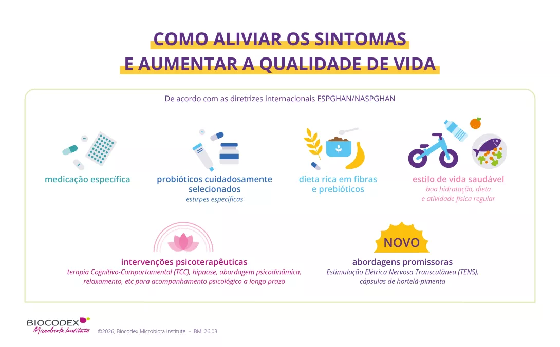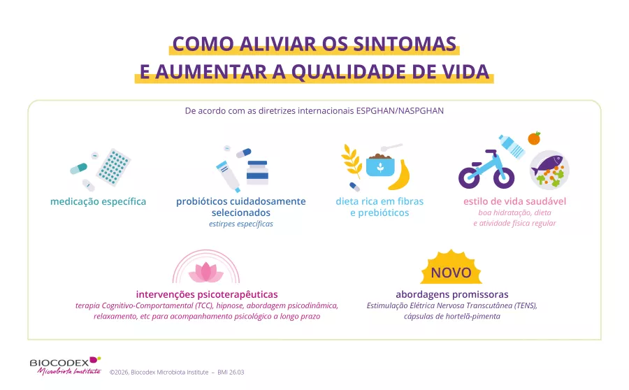 Uma dieta rica em fibras, o uso de probióticos (específicos (para estimular bactérias benéficas) ou antibióticos (para matar bactérias patogénicas), são estratégias que podem ajudar a Alice e o Afonso, sempre sob a supervisão médica 8,9.