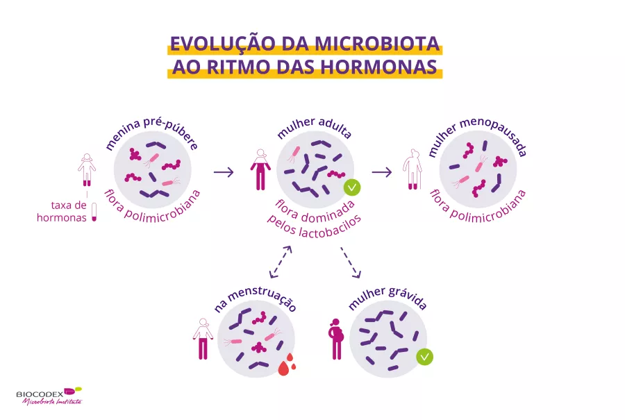 O corpo evolui ao longo da vida, e a microbiota vaginal faz o mesmo. A composição da microbiota vaginal muda radicalmente desde a infância, ao passar pela idade adulta, e até à menopausa.1 As alterações hormonais modificam o ritmo das nossas vidas e afetam também a microbiota vaginal. Por exemplo, a menstruação altera temporariamente a diversidade microbiana da vagina.8 A microbiota desempenha também um papel importante no parto.1,10 Durante a gravidez, ocorrem mudanças fisiológicas destinadas a adaptar o corpo da mãe ao feto e vice-versa.9 Na mulher grávida, a microbiota vaginal é mais estável, menos rica e menos diversificada,9 com elevados níveis de estrogénio a assegurarem o predomínio total dos lactobacilos.1,8 Por último, na menopausa, a microbiota vaginal atinge um novo equilíbrio.10