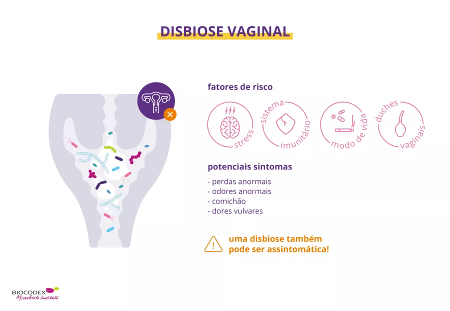 A disbiose vaginal ocorre quando os lactobacilos, bactérias fundamentais da flora vaginal, perdem a sua predominância, abrindo caminho para microrganismos oportunistas virem colonizar a vagina.8,11 A presença destes está frequentemente associada a corrimentos vaginais, comichão (prurido) e ardor, ou ainda a um cheiro a peixe, mas também pode ser assintomática.8