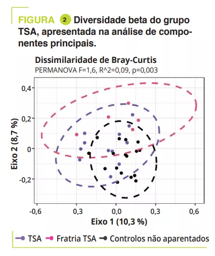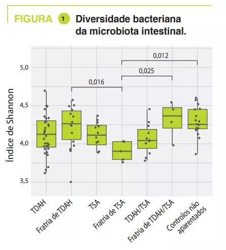 O estudo incluiu 95 crianças com idades compreendidas entre os 5 e os 17 anos, 32 com TDAH, 12 com TSA, 11 com TDAH/TSA, 14 fratrias, 5 fratrias, 4 fratrias e 17 controlos não relacionados. As perturbações digestivas foram a obstipação: TDAH 15,6% (fratria 7,1%), TSA 8,3% (fratria 0%), TDAH/TSA 18,2% (fratria 0%), controlos 5,9%; dor abdominal: TDAH 3,1% (fratria 0%), TSA 16,7% (fratria 0%), TDAH/TSA 18,2% (fratria 0%), controlos 0%; e menos frequentemente refluxo gastroesofágico. A dieta atípica foi encontrada principalmente na TSA (50%), marcada por uma dieta com pouca variedade. A análise da microbiota intestinal não revelou qualquer variação na diversidade alfa entre a TDAH, a TSA, a TDAH/TSA e os controlos aparentados ou não aparentados; no entanto, foi significativamente mais baixa nas fratrias da TSA (figura 1).