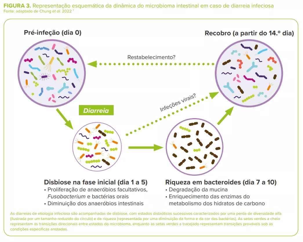 Por exemplo, na cólera, a microbiota intestinal é substancialmente modificada durante e após a infeção, em consequência da supressão da camada de muco juntamente com a comunidade microbiana intestinal residente e da produção da toxina pelo V. cholerae.13 Durante o recobro, a microbiota intestinal dos doentes com cólera repovoa-se lentamente através de um padrão de acumulação semelhante ao da maturação da microbiota intestinal observada nas crianças.3