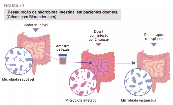 O fascinante percurso da descoberta da FMT tem raízes na China antiga, onde Ge Hong tratava doentes com diarreia grave utilizando uma “sopa amarela” constituída por uma suspensão de fezes. Nos tempos modernos, o Dr. Ben Eiseman utilizou enemas fecais de indivíduos saudáveis para tratar a enterocolite pseudomembranosa em 1958. Atualmente, existe um interesse crescente no transplante de microbiota fecal (FMT) como tratamento para a infeção recorrente por Clostridioides difficile (CDI), o que aponta para a sua utilidade [22]. Estão em curso investigações sobre a sua eficácia na doença inflamatória intestinal, diabetes, cancro, cirrose hepática e doenças cerebrais como a doença de Parkinson [23]. Os benefícios da utilização da FMT em doentes com diarreia baseiam-se na ideia de que a flora microbiana saudável introduzida através da FMT tem a capacidade de superar os agentes patogénicos e restaurar a composição de um microbioma intestinal saudável (figura 3).