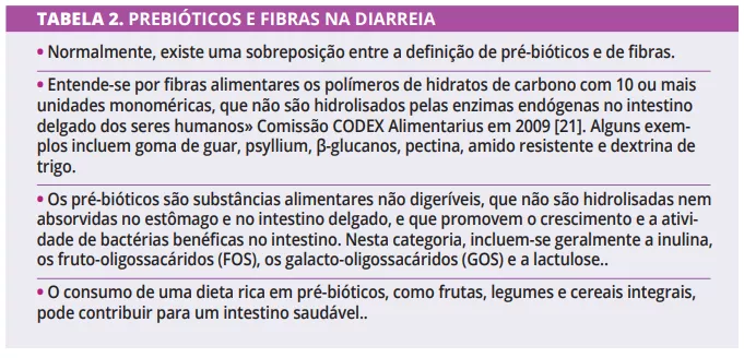 Existem poucos dados sobre os pré-bióticos e as fibras no tratamento da diarreia (tabela 2). Aparentemente, os pré-bióticos são mais propensos a prevenir e tratar a recorrência da diarreia. Ao mesmo tempo, as fibras, principalmente as viscosas, são mais indicadas nos episódios agudos devido à sua capacidade de retenção de água. Outras opções terapêuticas envolvem, em alguns casos, a administração de probióticos e (tabela 3), em casos graves, o uso de transplante de microbiota fecal (FMT).