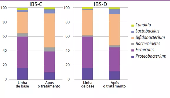 Na análise microbiana fecal, verificou-seum aumento da proporção de géneros bacterianos associados a benefícios para a saúde (por exemplo, Bifidobacterium e Lactobacillus), tanto para a IBS-C como para a IBS-D (IBS-C: 31,1 ± 16,7% vs. 47,7 ± 13,5%, p = 0,01; IBS-D: 35,8 ± 16,2% vs. 44,1 ± 15,1%, p = 0,01). Por outro lado, verificou-se que os géneros de bactérias nocivas, incluindo Escherichia, Clostridium e Klebsiella, diminuíram após o tratamento (21,3 ± 16,9% vs. 16,3 ± 9,6%, p = 0,02). Não foram encontradas particularidades nas crianças com DF.