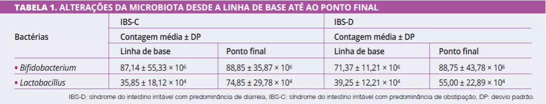Na linha de base, antes de qualquer intervenção simbiótica, os perfis de Bifidobacterium eram significativamente diferentes entre IBS-C e IBS-D (87,14 ± 23,19 vs. 71,37 ± 12,24; p = 0,02), com contagens mais baixas em IBS-D. A administração simbiótica teve um efeito significativo nos perfis bacterianos desde a linha de base até ao fim do tratamento em ambos os grupos IBS-C e IBS-D (Tabela 1).