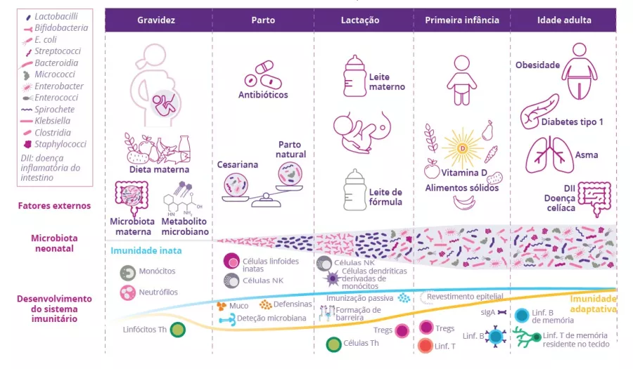 Ao longo da gravidez, os metabolitos microbianos (oriundos da dieta e da microbiota maternas) influenciam o desenvolvimento imunitário fetal. Desde o nascimento, a colonização da microbiota começa em paralelo com o desenvolvimento do sistema imunitário. Nesta fase, o recém-nascido depende ainda da proteção materna que lhe é assegurada pela amamentação: o leite materno contém antigénios bacterianos originários da mãe que estimulam a maturação do sistema imunitário inato da mucosa. Relativamente à colonização da microbiota intestinal, as famílias bacterianas Enterococcacae, Clostridiaceae, Lactobacillaceae, Bifidobacteriaceae e Streptococcaceae são dominantes nas primeiras semanas de vida. A introdução dos alimentos sólidos na dieta da criança leva a um aumento da diversidade da microbiota intestinal, que evolui para uma microbiota mais adulta: a abundância em Bifidobacteriaceae diminui, enquanto Bacteroides, Ruminococcus e Clostridium se tornam mais predominantes. O tipo de parto, o leite materno, os alimentos sólidos e a ingestão de antibióticos são fatores que moldam a microbiota e o sistema imunitário neonatal.
