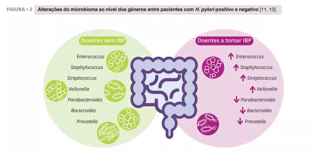 Imhann et al. analisaram o microbioma de 211 indivíduos que utilizavam IBP através da sequenciação da região V4 do gene 16S rRNA. Observaram uma diminuição significativa da diversidade alfa entre os utilizadores de IBP e um aumento da abundância de bactérias dos géneros Enterococcus, Streptococcus, Staphylococcus e Veillonella (figura 2). Os géneros Enterococcus e Veillonella têm sido associados a uma maior suscetibilidade a infeções por Clostridium difficile 11. . Embora os IBP sejam geralmente considerados seguros, com efeitos secundários relativamente raros, as provas sugerem que têm um impacto negativo no microbioma intestinal.