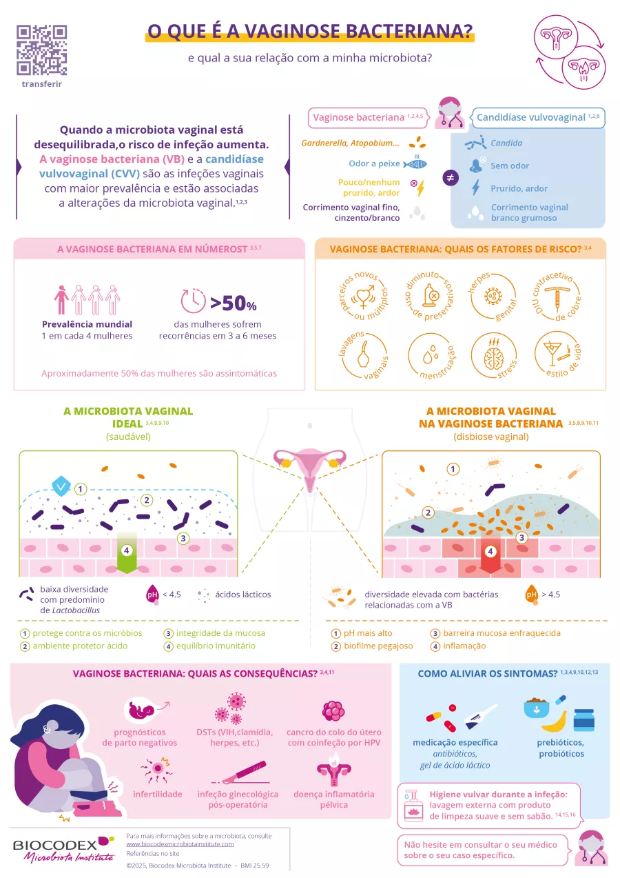 Este infográfico explica o que é a vaginose bacteriana, como ela difere da candidíase vulvovaginal, seus principais fatores de risco e possíveis consequências, e como os sintomas podem ser aliviados. Compreender o papel da microbiota vaginal é fundamental para uma melhor prevenção e cuidados.