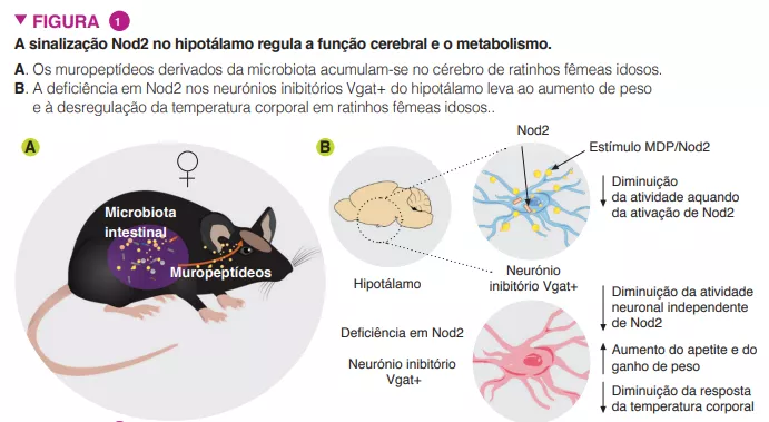 A microbiota afeta o metabolismo e dados recentes indicam que as bactérias intestinais estão envolvidas no comportamento alimentar dos ratos. Um dos desafios neste campo é definir as vias intestino-cérebro que ligam os compostos microbianos aos processos neuronais que afetam o apetite. Neste estudo, Gabanyi e a sua equipa identificaram um papel funcional para o Nod2, um recetor de reconhecimento de padrões moleculares para muropeptídeos bacterianos (componentes da parede celular bacteriana), na regulação do apetite e da temperatura corporal em ratinhos fêmeas idosos. Os autores descobriram que os muropeptídeos se acumulam no cérebro de ratos idosos e regulam a atividade dos neurónios inibitórios no núcleo arqueado do hipotálamo. Uma deficiência específica de Nod2 nestes neurónios conduz a um aumento do apetite, a um aumento de peso e a uma redução da resposta da temperatura corporal, todos eles dependentes da presença de microbiota. Estes resultados sugerem que a regulação da atividade neuronal pela sinalização Nod2 no cérebro afeta comportamentos complexos em ratos e merece um estudo mais aprofundado.
