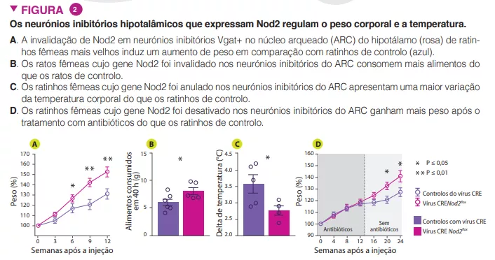 Finalmente, para examinar o papel da microbiota nas variações dependentes de Nod2 na regulação do apetite e da temperatura, os autores administraram antibióticos de largo espetro a ratinhos cujo gene Nod2 tinha sido especificamente invalidado nos neurónios hipotalâmicos. Os ratinhos hipotalâmicos deficientes em Nod2 submetidos a tratamento com antibióticos apresentaram apetite e ganho de peso normais até à retirada dos antibióticos, altura em que apresentaram um aumento do apetite e do ganho de peso em comparação com os ratinhos de controlo não deficientes em Nod2. Estes dados sugerem que os produtos derivados da microbiota podem modular o apetite em ratinhos fêmeas através de um mecanismo dependente de Nod2.