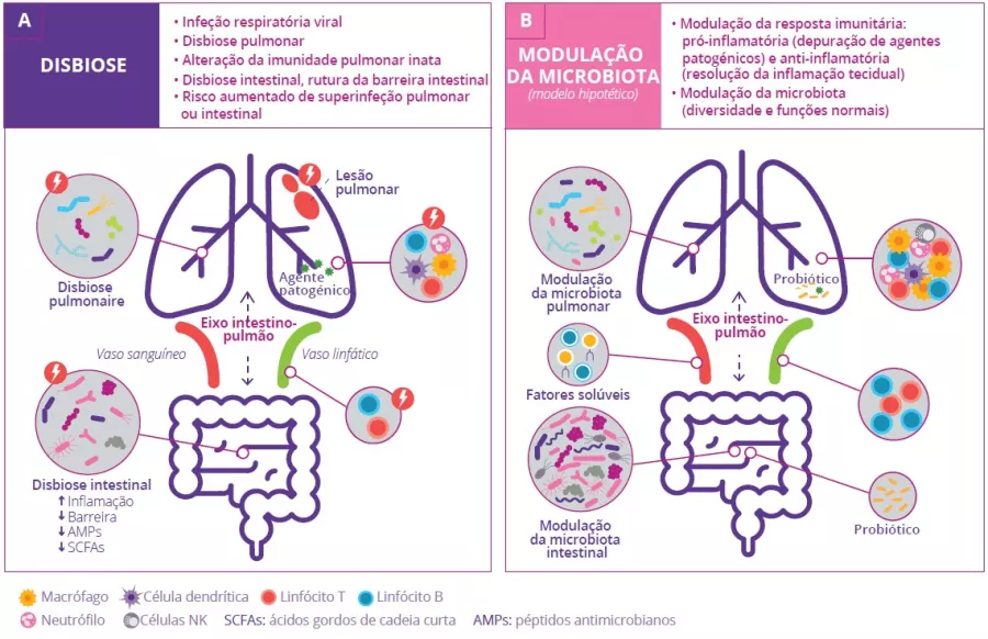 FIGURA 7: Eixo intestino-pulmão durante infeção respiratória viral (A) e modelo de modulação da microbiota mediante o uso de probióticos (B).
